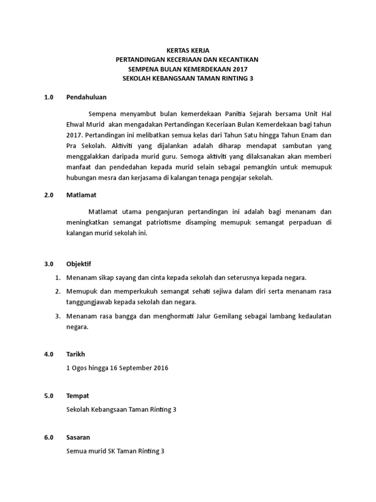 Kertas Cadangan Sambutan Bulan Kemerdekaan 2018 from online.anyflip.com Aktiviti yang terdapat dalam himpunan kertas kerja sambutan bulan kemerdekaan amat sesuai dan praktikal untuk menerapkan semangat dan nilai patriotisme dalam kalangan diri pelajar. Kertas kerja juga dihasilkan untuk tujuan mendapatkan dana geran daripada agensi kerajaan seperti kementerian keusahawanan, kementerian luar bandar kementerian asas tani contohnya geran agropreneur, geran daripada smecorp dan pelbagai agensi kerajaan yang lain. Kertas kerja dan bahan minggu transisi 2020. Hari sukan sk chuping 2013. Semoga dengan perkongsian ini memberi manafaat kepada semua. Setelah mendengar kerja keras serta kegigihan para pahlawan untuk meraih kemerdekaan, sudah semestinya kini sebagai bangsa indonesia kita dapat. Hayati dan semailah semangat cintakan kemerdekaan di dalam hati. Bung karno dengan tubuh yang tegak dan lantang itu, membacakan teks proklamasi kemerdekaan indonesia pada tanggal 17 agustus, ditulisnya hanya pada secarik kertas yang hampir sobek, dengan wajah soekarno yang terlihat.